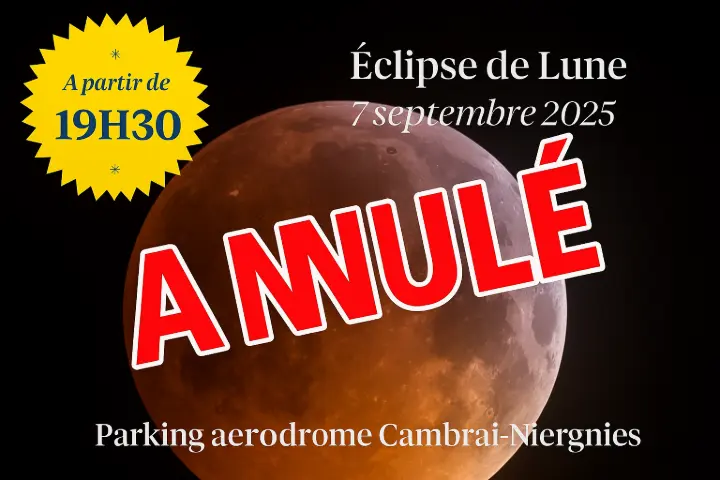 En raison des conditions météorologiques défavorables annoncées, nous sommes contraints d’annuler l’observation publique de l’éclipse de Lune prévue ce dimanche 7 septembre 2025 à partir de 19h30 sur le parking de l’aérodrome de Cambrai-Niergnies.